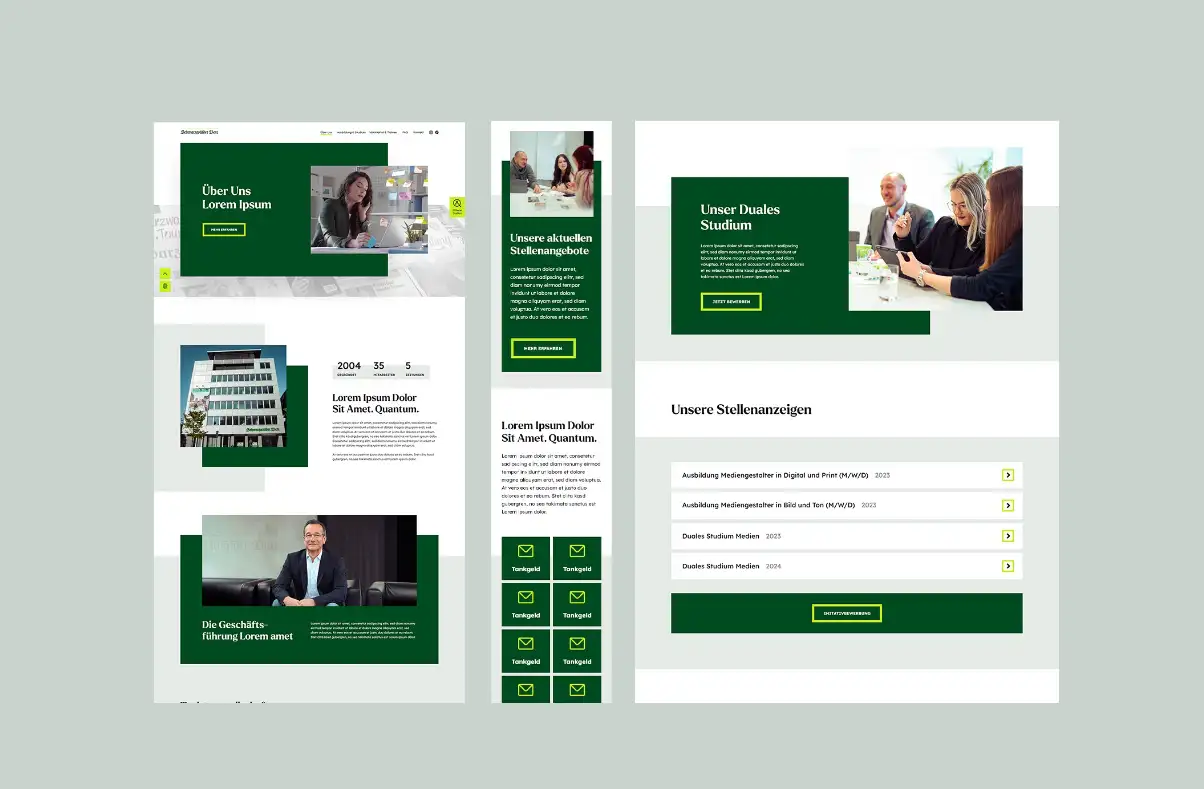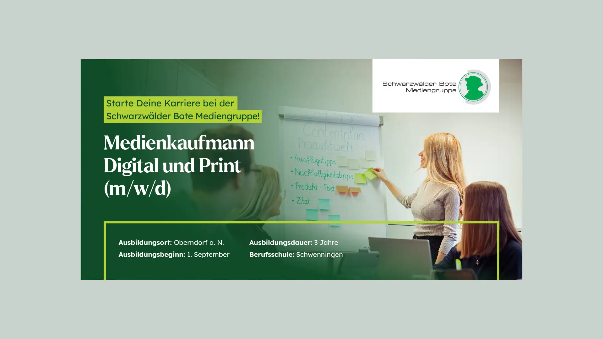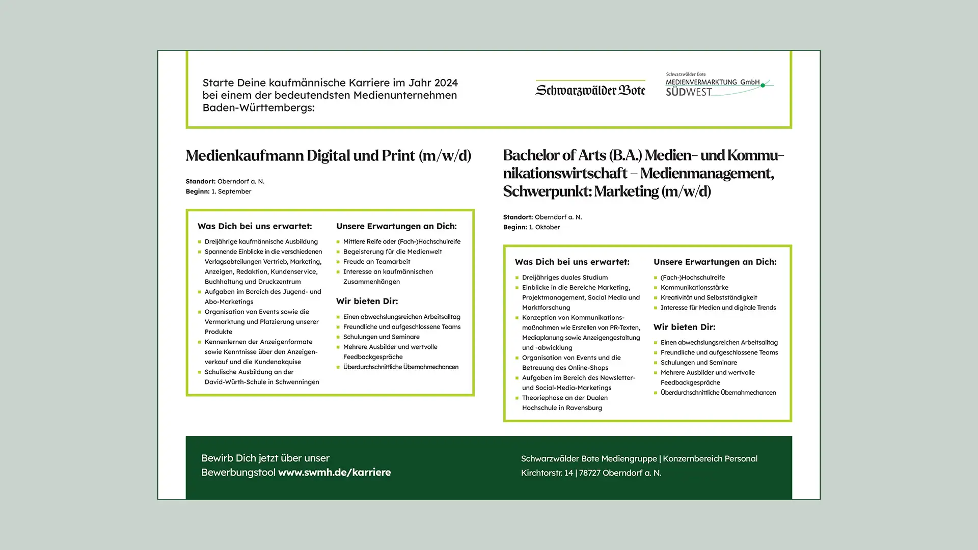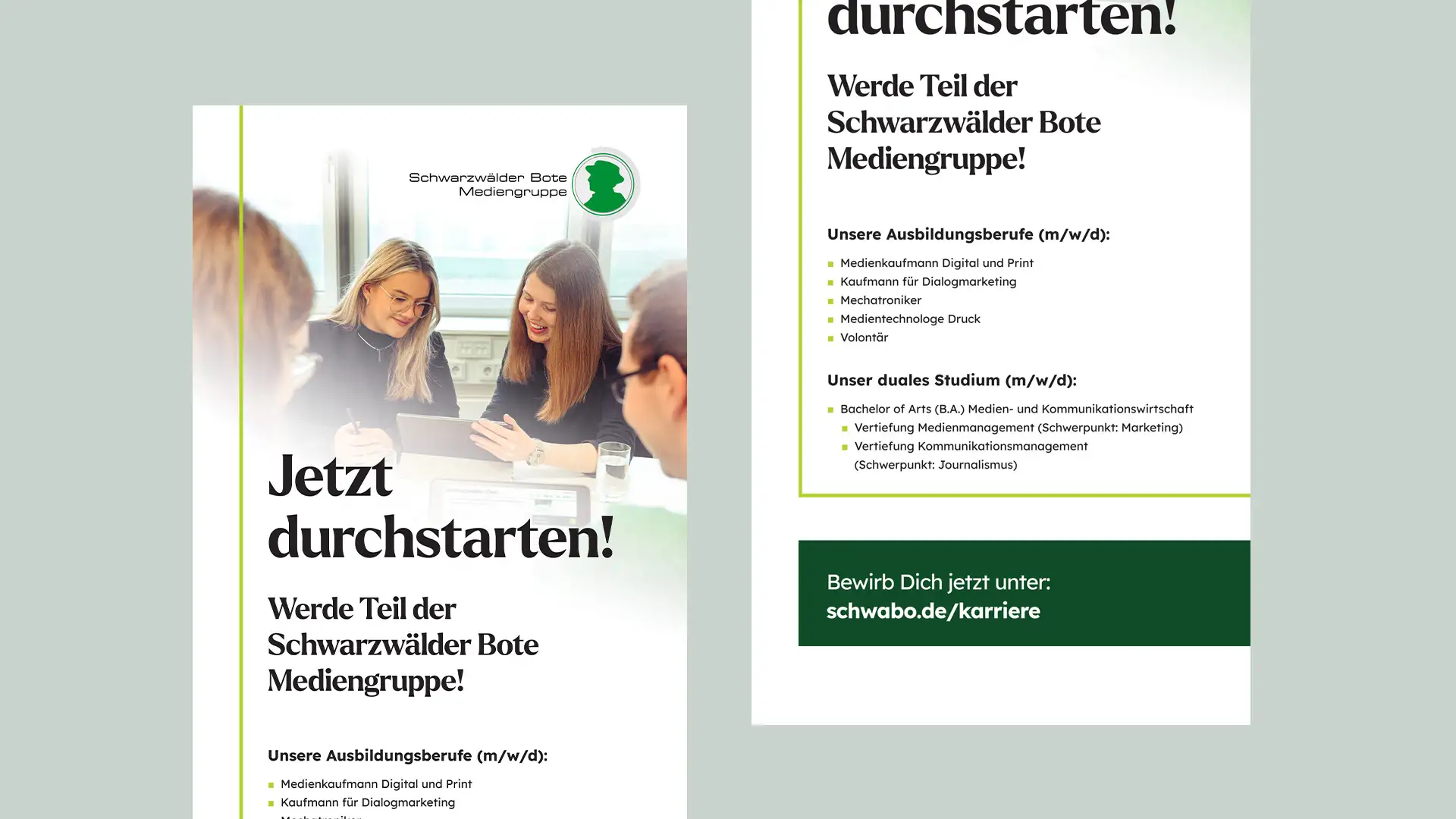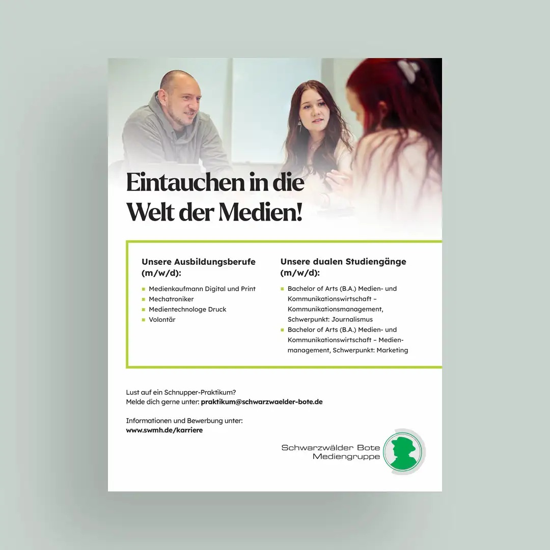 Unsere Zusammenarbeit mit der Schwarzwälder Bote Mediengruppe erstreckte sich über eine Neugestaltung der Karrieresseite und eine umfassende visuelle Auffrischung. Mit einem modernen Erscheinungsbild wollten wir den Karrierebereich für junge Talente attraktiver gestalten. Zusätzlich zu einem frischen Look für die Website haben wir Printmaterialien entwickelt, darunter Anzeigen, Flyer und Rollups, um das neue Auftreten nahtlos auf Printmedien zu übertragen. Wir haben auch einen einheitlichen, frischen Bildlook entwickelt, professionelle Bildbearbeitung durchgeführt und passende Bewegtbilder für die Website geschnitten und aufgewertet.